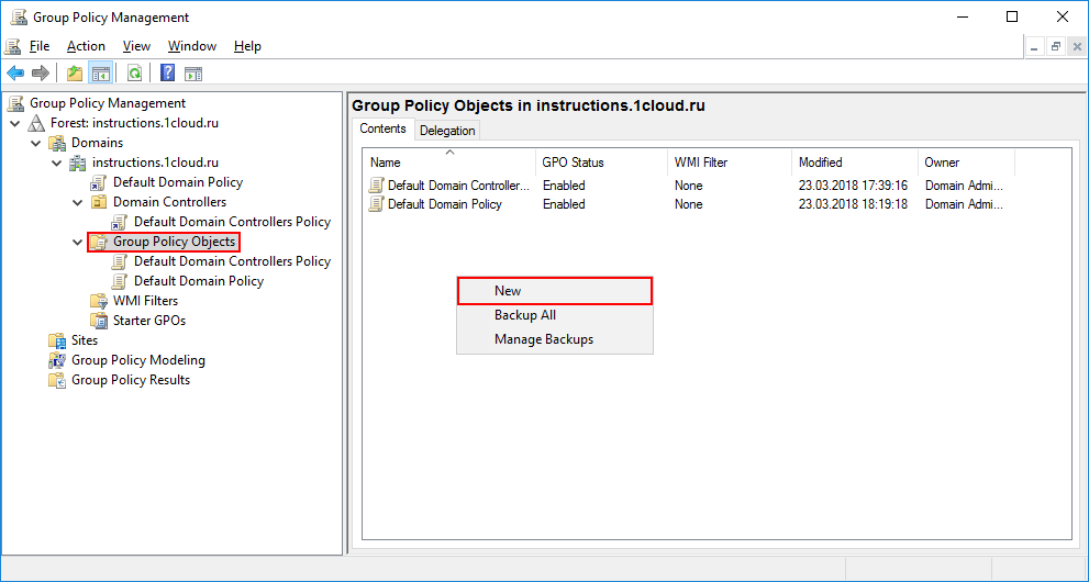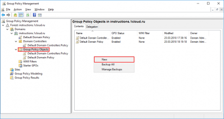 Для настройка групповых политик на windows перейдите во вкладку Forest -> Domains -> <Ваш домен> -> Group Policy Objects. С помощью правой кнопки мыши откройте меню и выберете New.