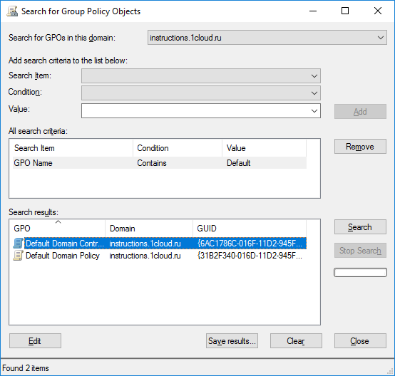 Открывшееся окно поиска интуитивно понятно для работы. В первую очередь выберете конкретный домен для поиска, также можно производить поиск во всех доменах сразу. Далее выберете нужный пункт поиска, задайте условие и значение. В примере ниже производился поиск объектов групповой политики, в которых встречается слово Default.