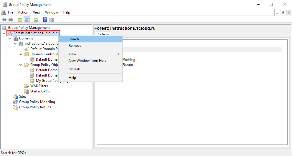 Как правило в корпоративных средах большое количество групповых политик, чтобы было проще найти нужный объект GPO, оснастка обладает встроенным поиском. Для этого выберете ваш лес и в контекстном меню кликните Search.