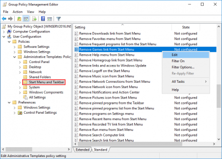 В редакторе групповых политик перейдите по иерархии User Configuration -> Policies -> Administrative Templates -> Start Menu and Taskbar. Найдите опцию Remove Games link from Start Menu и в контекстном меню выберете пункт Edit.