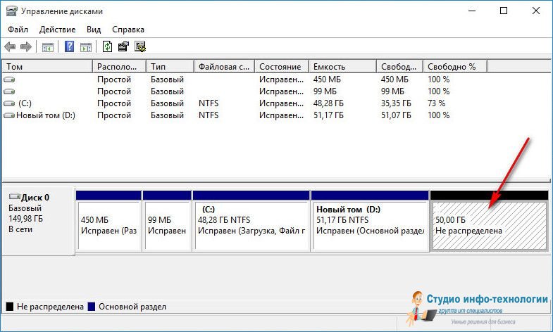 В окне управления дисками увидим, собственно, то, о чем говорилось чуть выше – 50 Гб, на которые в нашем случае был увеличен диск виртуальной машины, является нераспределенным пространством.